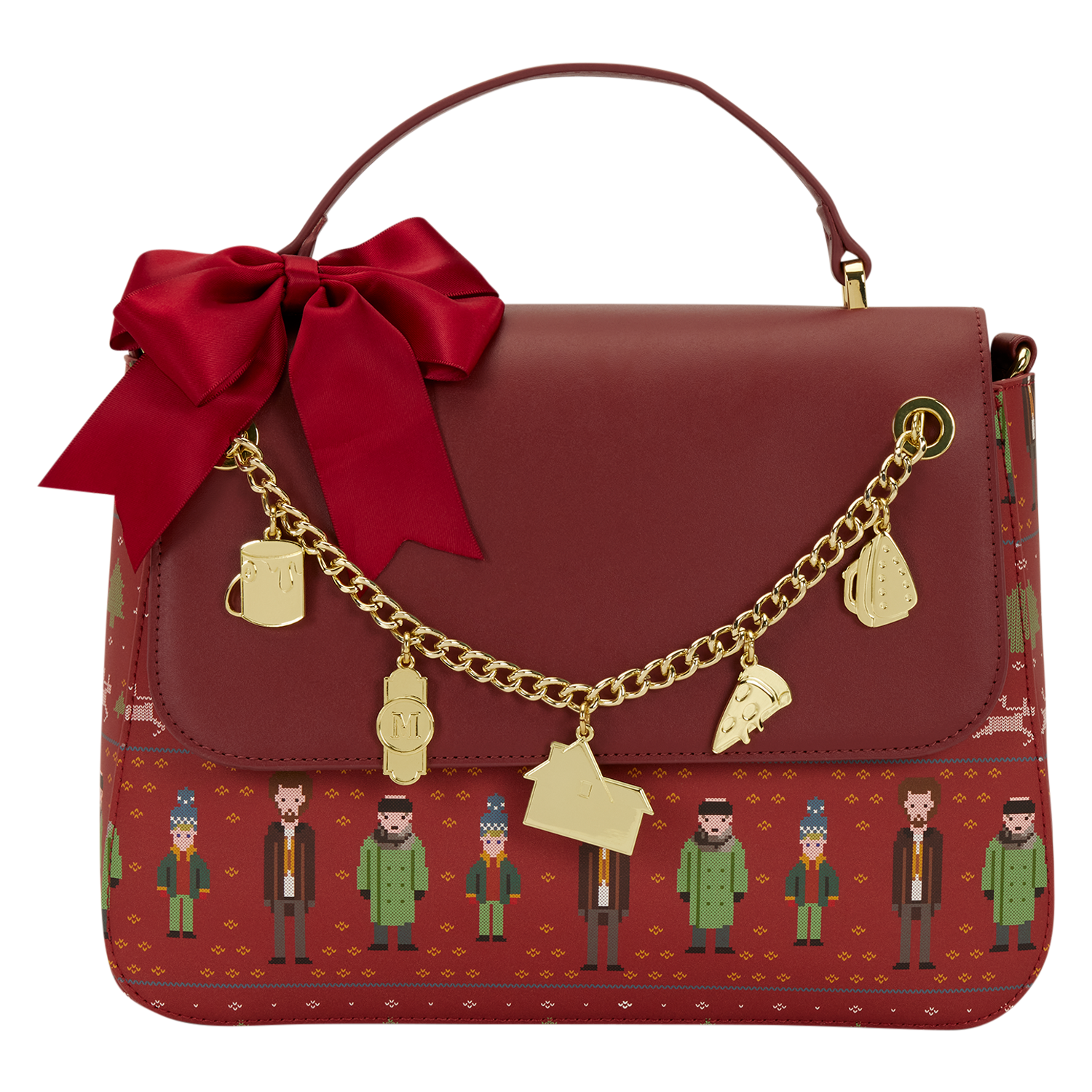 The body of this crossbody bag features images of Kevin, Harry, and Marv amongst other seasonal designs inspired by a holiday sweater. The top flap features metal charms of various items from the movie, like the McCallister home, pizza, and an iron! A 3D bow attached to the top handle brings the look together.